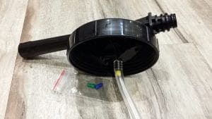 2. Attach the Quick Release Collar to the front of the Spray Nozzle and a water hose to the bottom. To attach these to the lid, push the Quick Release Collar onto the lid until it clicks.